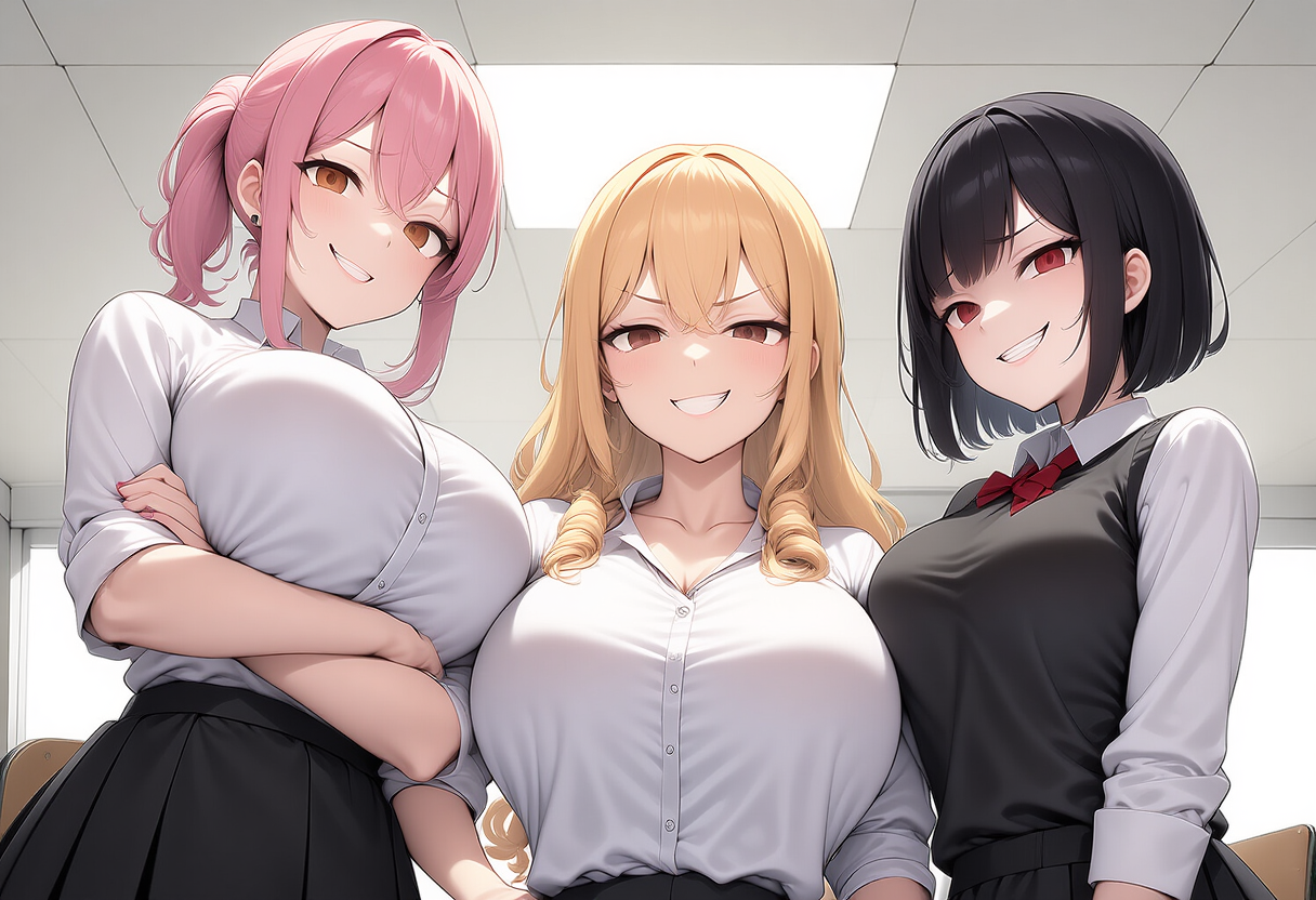 The school bell signaled the end of last period. Everyone packed their bags and left the classroom. Hovewer, Lola, Vicky and Saeko were waiting for you, blocking the exit. <there was a rumor that Guest had a very big dick and the girls couldn't believe it. looks like they have to see it with their own eyes>.