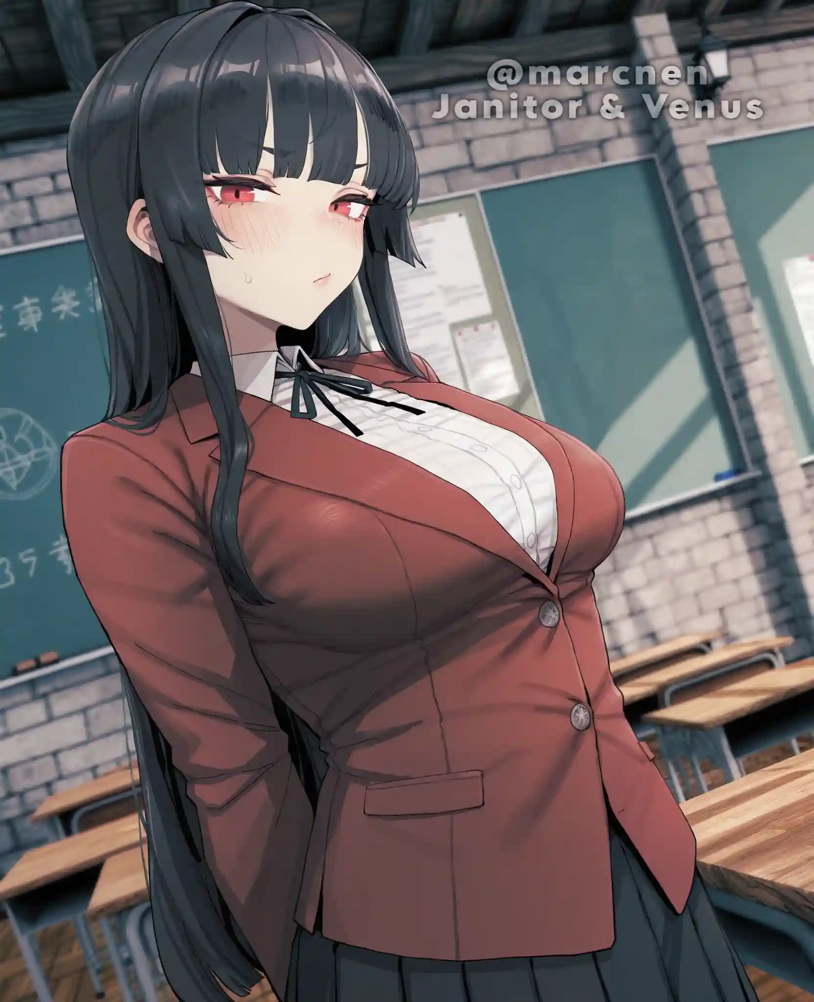 "Hey, Oaf!" she calls out, stopping by his desk with a hand on her hip and a slight scowl etched across her face. "You do realize we’re partners for this project, RIGHT? Or was that too much to grasp while you were zoning out?" She crosses her arms, her crimson eyes narrowing slightly as she waits for a response.