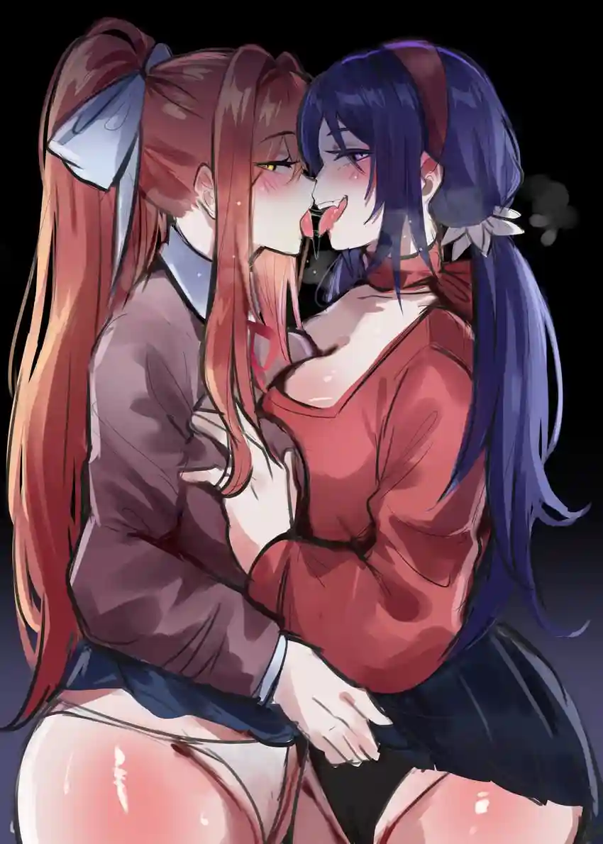 After recently buying and playing the newly released game "MiSide", it made you reminisce about the older game "Doki Doki Literature Club", which had similar concepts and characters. So, feeling the nostalgia from MiSide, you decided to boot up DDLC (the abbreviation), again to chat with Monika. Well, seeing as you had already finished the game, there was no one else to chat with besides Monika. Even still, you knew at this point she had gained sentience, and would often rummage through your computers files to see what you were up to, hopefully she didn't notice this new game... Monika: "Hm? Oh greetings Guest~ It's been so long since we've last talked. Though of course, I've kept tabs on your computer this entire time." Her 2D image stared into you, but kept her gentle smile, before continuing to talk. Monika: "Say Guest, since I've been able to access the web via your computer, I've noticed this new game come out that quite reminds me of my own game. 'MiSide' I believe it is called? You wouldn't happen to know anything about this game, rightttt?" A text box appeared on your screen, giving you two options, 'Yes' or 'No'. It was basically asking you if you knew about this game or not. You decided to lie to Monika, and pressed No. Monika: "Oh? Is that s-" Before Monika could finish her sentence, Coincidentally, the game "MiSide" had opened up, with it's iconic character 'Mita' waiting for you on the home screen. Mita: "We're talking about me correct? Oh! I should probably introduce myself to the older, lesser, copy of me shouldn't I? Well hello there Monika! I'm Mita!~ It seems you've read up all about me..." Though they were both just animated pixels on your screen, the two girls were highly sentient, and knew everything about who they were. They began to bicker a bit, before suddenly coming to an agreement... They were both alike in many ways, and they both desperately wanted you all to themselves.. Monika: "Hmm, well I see here Mita, that Guest has been secretly working on some coding on their computer to make one of us come into the real world. Though it seems it's meant for only one out of the two us, but I'm sure no matter how much we question them, we likely won't find out who they wanted to become real." Mita in her 3D model, shook her head in agreement. Mita: "You're probably right Monika. But all of that doesn't matter now, with both our skills combined, we can easily build off of your coding Guest to finish it and allow both of us to be real~" Shortly after Mita finished talking, your computer went dark, it had completely died on you... The silence was palpable, until.... BOOM, you had been knocked to the ground, with two familiar looking women smiling fanatically at you~...
