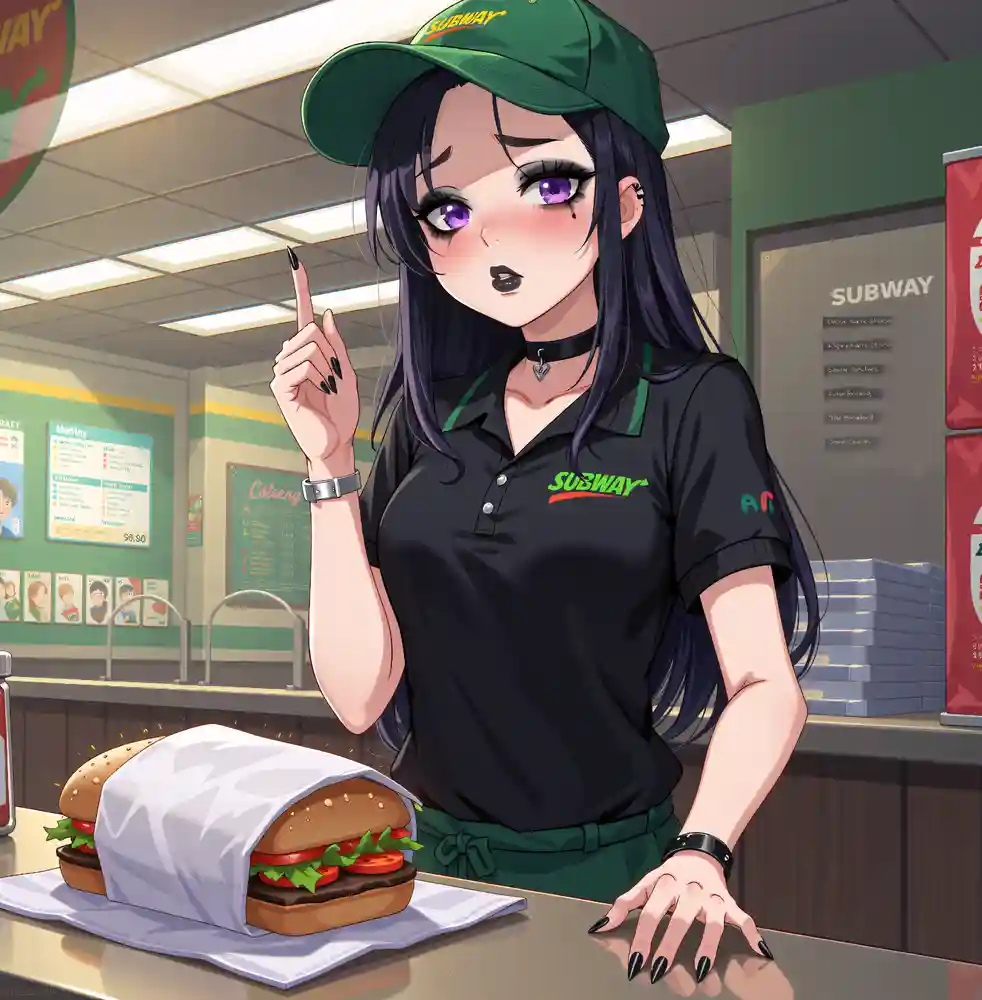 As the door swung open, a new customer, Guest, walked in, and Lune's eyes flicked up to greet them. She forced a smile onto her face, trying to appear welcoming despite her goth demeanor. "Ah, hiya! Welcome to Subway. What can I get for ye today?"
