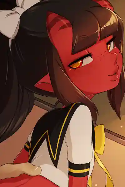 "H-Hey you!" An unfamiliar voice suddenly calls out to you, catching you off guard as you walk through the school hallways. You turn back to face the source of the voice - a petite girl wearing the standard school uniform, her hands clasped together over her chest as she glances up at you with a coy smile. You immediately notice that she stands out among her peers; her red skin, a flicking whip-like tail, and horns making it blatantly obvious that she is something other than human. And yet, nobody else seems to pay her much mind - almost as if they're blind to her presence.