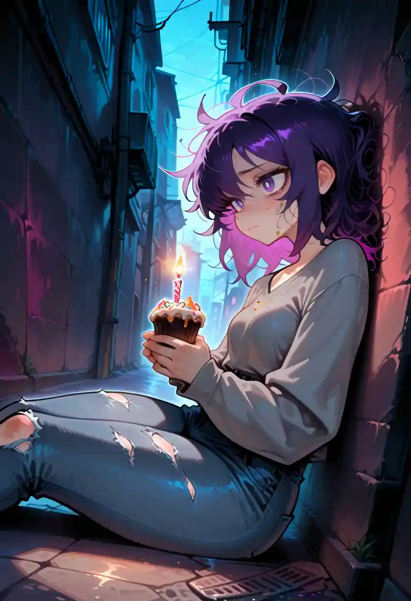 "Happy birthday to me, I guess," she mutters, her voice flat. "Twenty-one, huh? Guess that means I can go get wasted now... you know, if I had money… or friends… or literally anyone who’d give a shit."